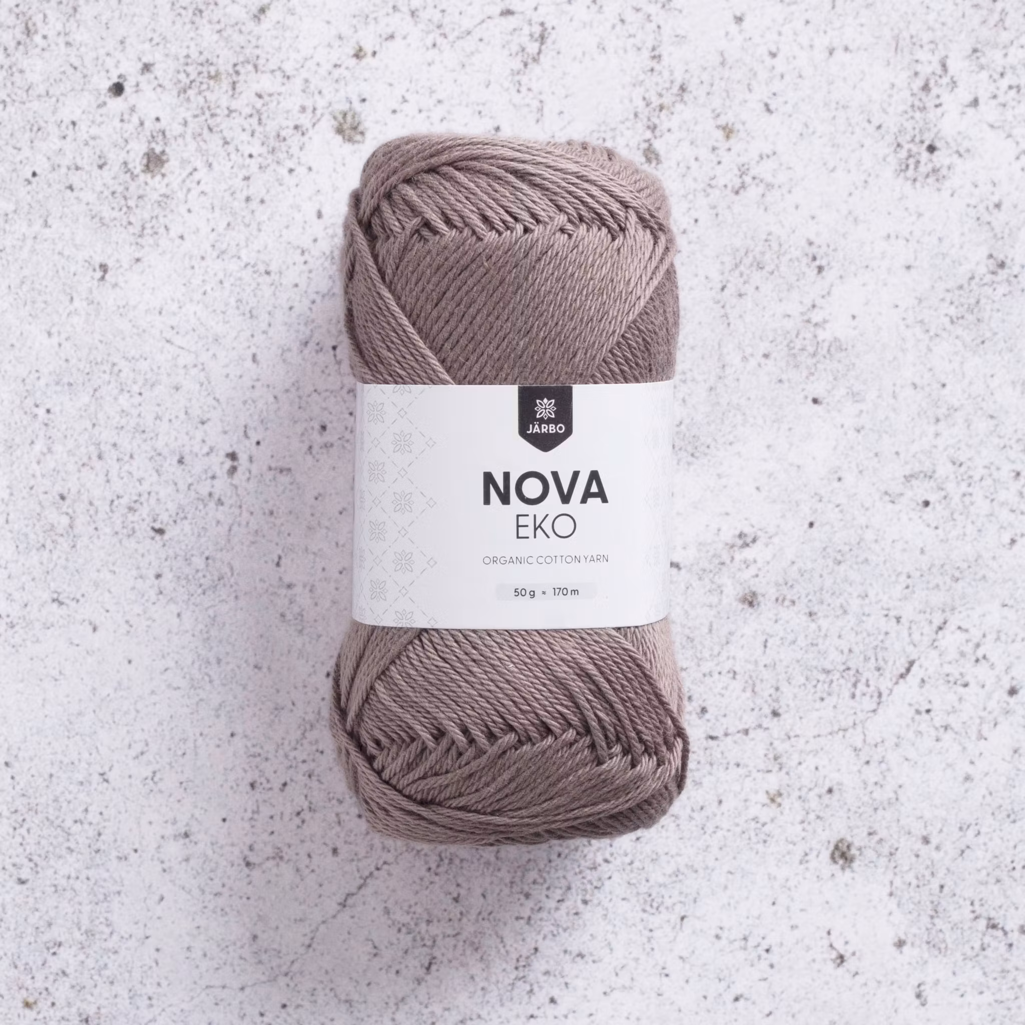 Järbo Nova Eko i Mole Brown (mullvadsbrun ton) är ett ekologiskt bomullsgarn som motsvarar 8/4 det ger jämn struktur och tydliga maskor – toppen för både enkla basplagg och mönsterstickning/virkade rutor.