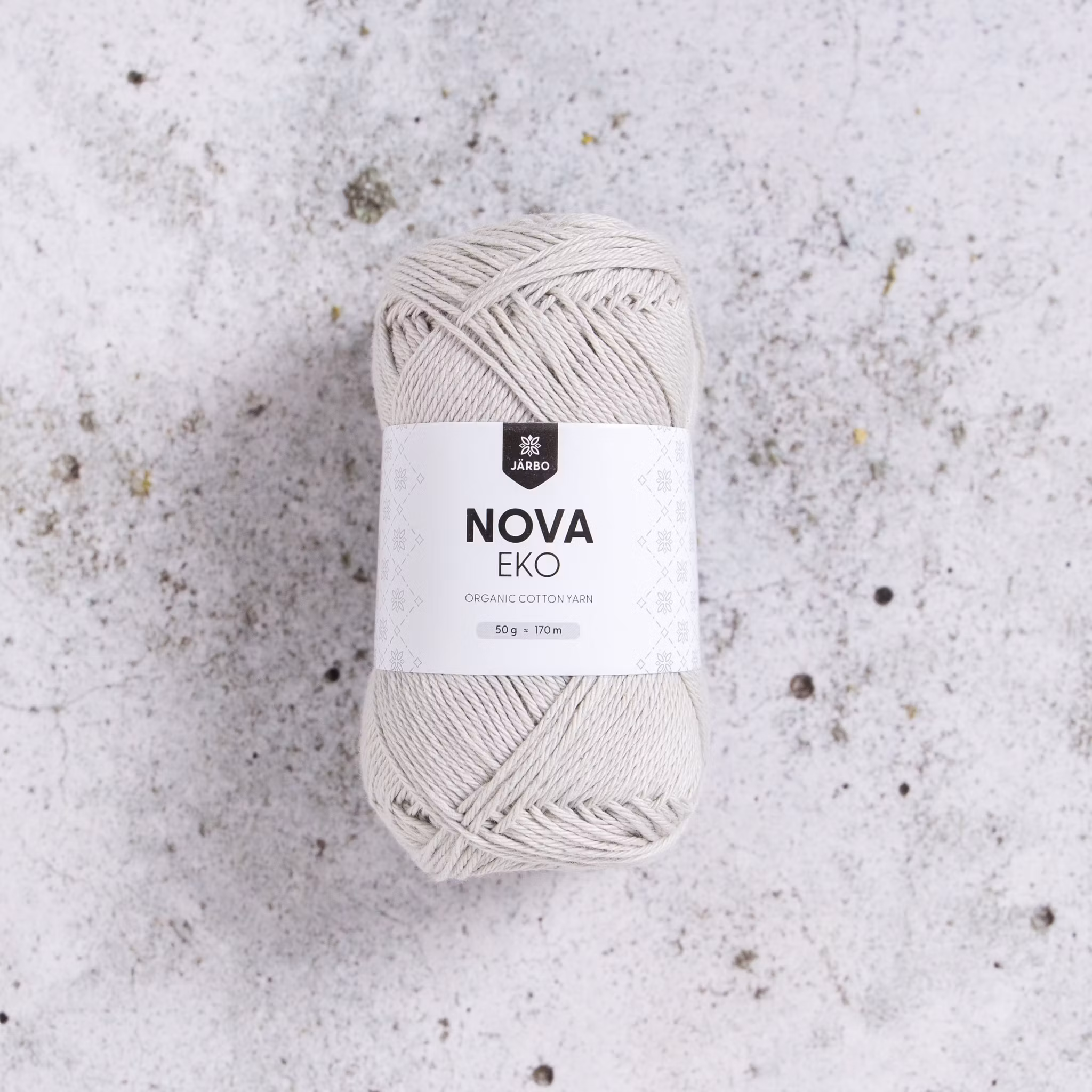 Järbo Nova Eko i Greyish (gråtonad nyans) är ett ekologiskt bomullsgarn som motsvarar 8/4 det ger jämn struktur och tydliga maskor – toppen för både enkla basplagg och mönsterstickning/virkade rutor.