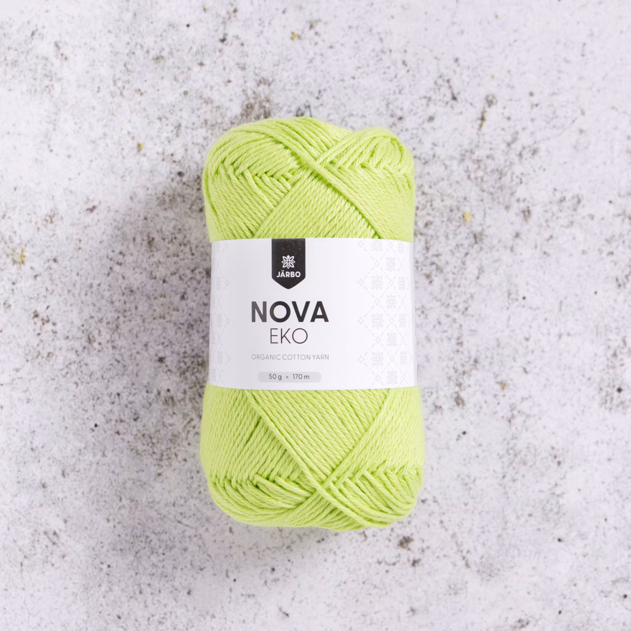 Järbo Nova Eko i Glowing Lime (lysande lime) är ett ekologiskt bomullsgarn som motsvarar 8/4, det ger jämn struktur och tydliga maskor – toppen för både enkla basplagg och mönsterstickning/virkade rutor.