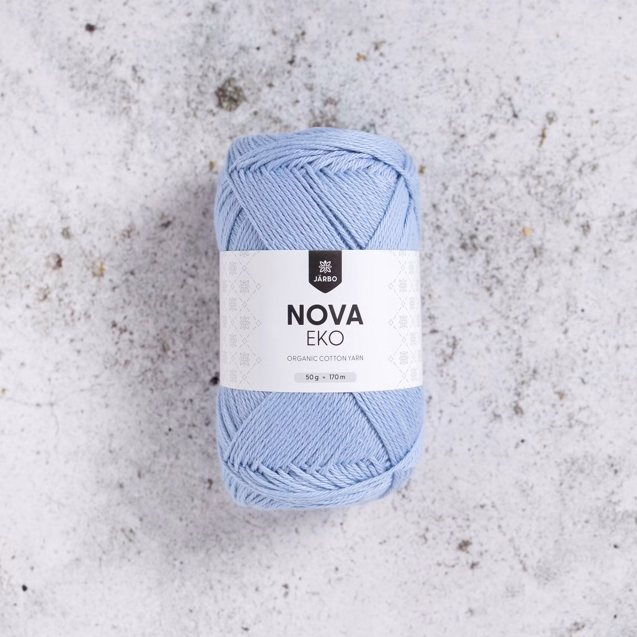 Järbo Nova Eko i Forget Me Not (Babyblå) är ett ekologiskt bomullsgarn som motsvarar 8/4, det ger jämn struktur och tydliga maskor – toppen för både enkla basplagg och mönsterstickning/virkade rutor.