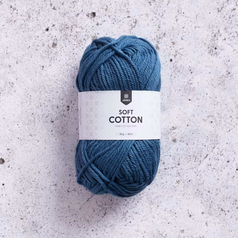 Soft Cotton är ett av Järbos mest populära bomullsgarner. Mjukt och följsamt, i en härligt pigg färgpalett med mycket att välja på. Soft Cotton är förstahandsvalet för dig som söker ett lite tjockare bomullsgarn som snabbt blir till roliga pyssel och virkprojekt. 50 g = 80 m. 100 % bomull.