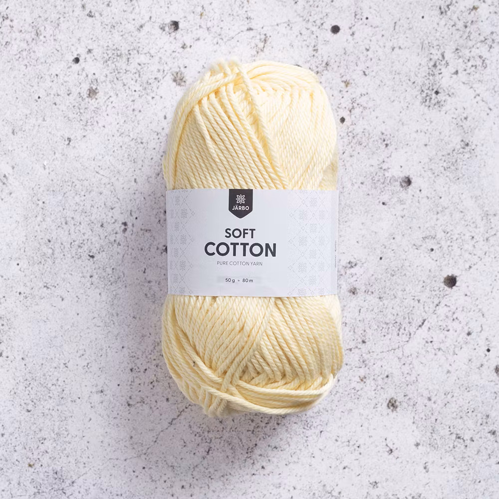 Soft Cotton är ett av Järbos mest populära bomullsgarner. Mjukt och följsamt, i en härligt pigg färgpalett med mycket att välja på. Soft Cotton är förstahandsvalet för dig som söker ett lite tjockare bomullsgarn som snabbt blir till roliga pyssel och virkprojekt. 50 g = 80 m. 100 % bomull.