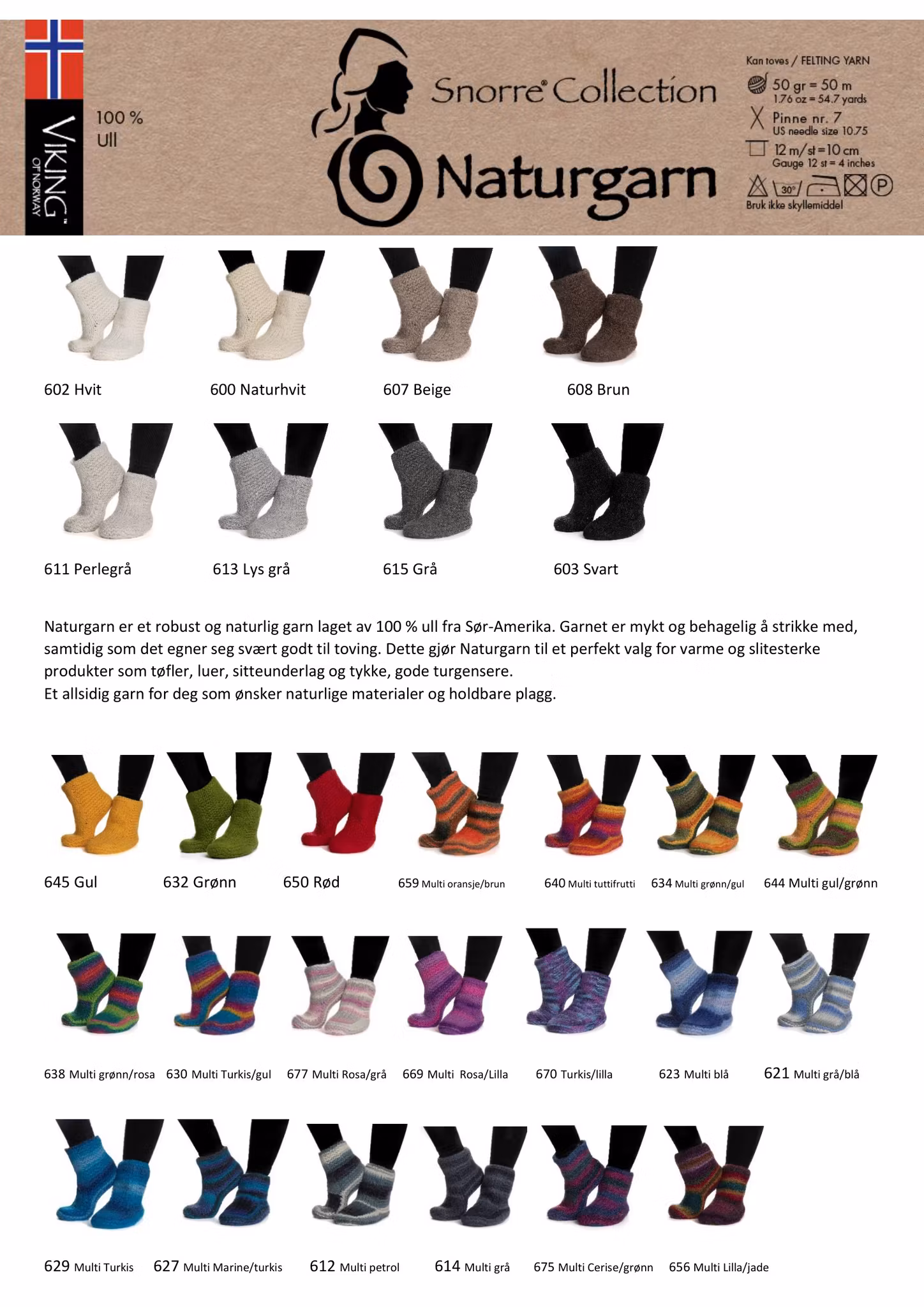 Naturgarn – 100 % Ull (Snorre Collection) är ett robust och naturligt garn tillverkat av 100 % ull från Sydamerika. Garnet är mjukt och behagligt att sticka med, samtidigt som det lämpar sig mycket bra för tovning. Tack vare sin värmande och slitstarka kvalitet är Naturgarn ett perfekt val för produkter som ska hålla länge, exempelvis tofflor, mössor, sittunderlag och tjocka, rejäla tröjor för friluftsliv. Ett mångsidigt garn för dig som vill arbeta med naturliga material och skapa hållbara plagg.