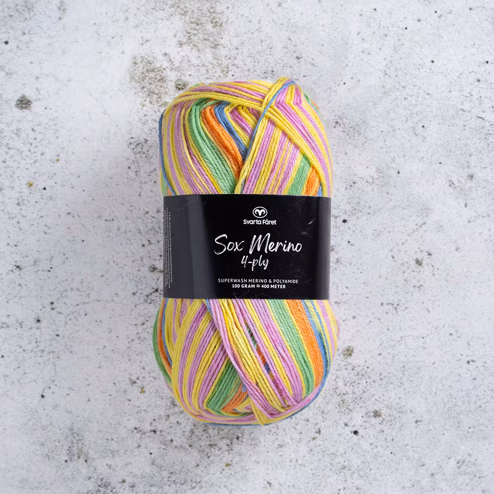 Svarta Fåret Sox Merino 4 ply i Jellybean Row är ett tunt sockgarn som kombinerar mjuk merinoull med extra slitstyrka. Det är ett bra val för sockor som ska användas ofta och samtidigt kännas riktigt sköna.