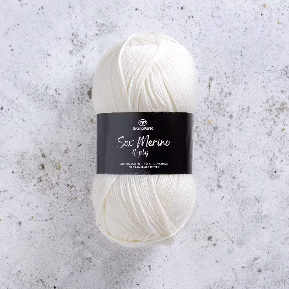 Svarta Fåret Sox Merino 4 ply i Natural White är ett tunt, mjukt och slitstarkt sockgarn som passar lika bra till vardagssockor som till lätta plagg och accessoarer. Merinoullen ger en skön känsla mot huden och polyamiden bidrar med extra hållbarhet så att dina projekt håller länge.